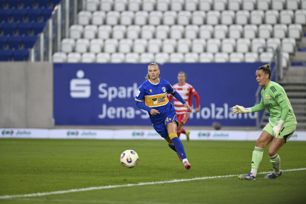 Ein Freistoß aus dem Halbfeld, eine perfekte Hereingabe — und Dina Orschmann köpfte zum 1:2 ein. Bitterer hätte ein Abend für Jena kaum enden können.